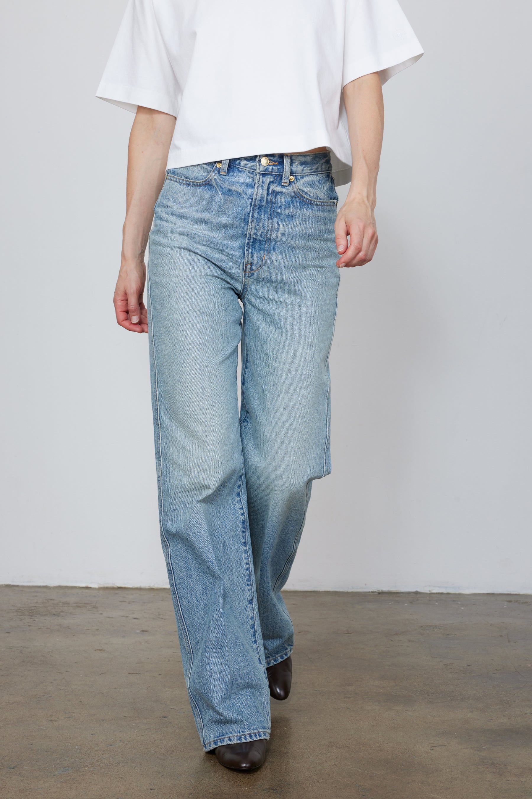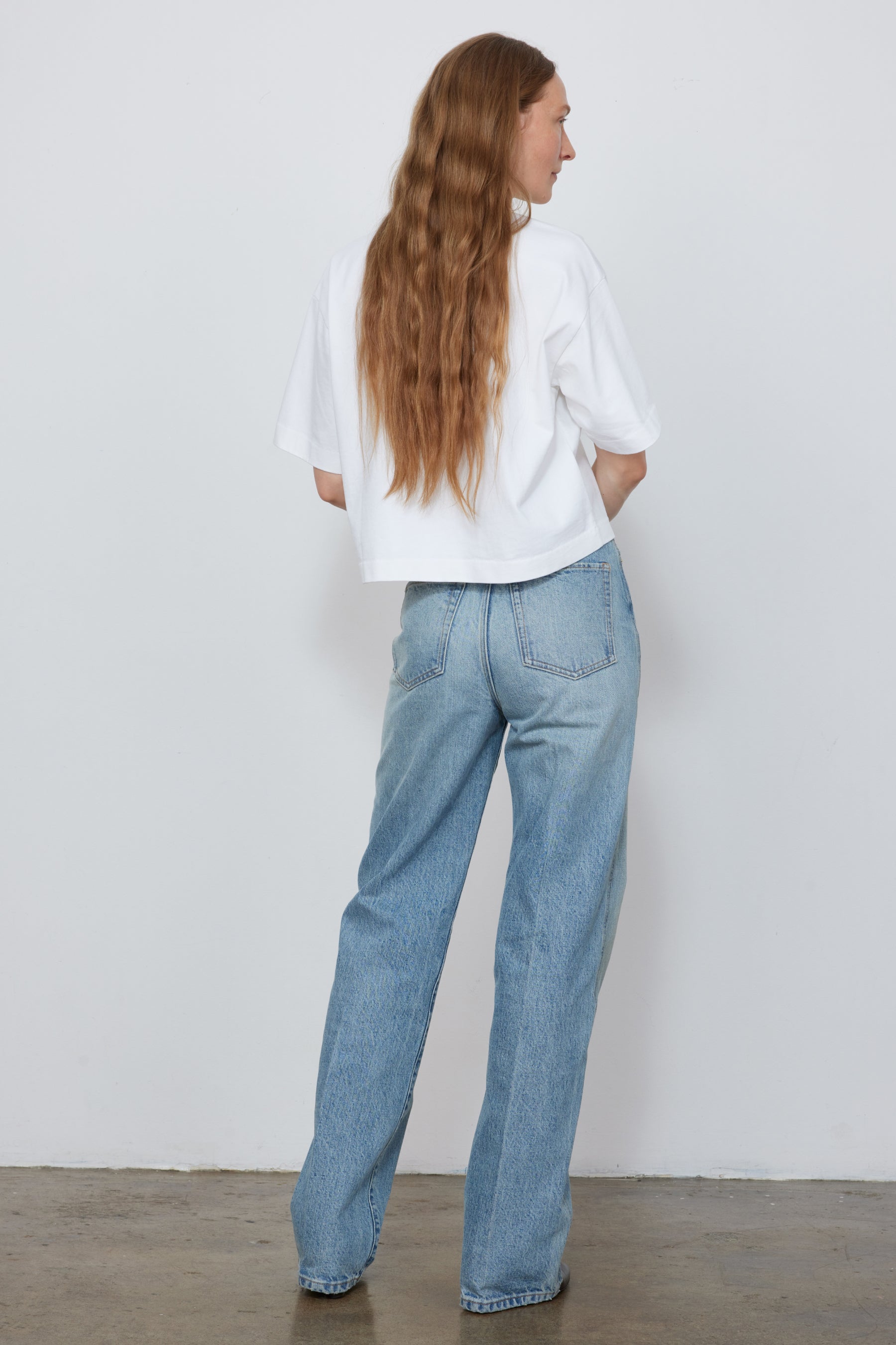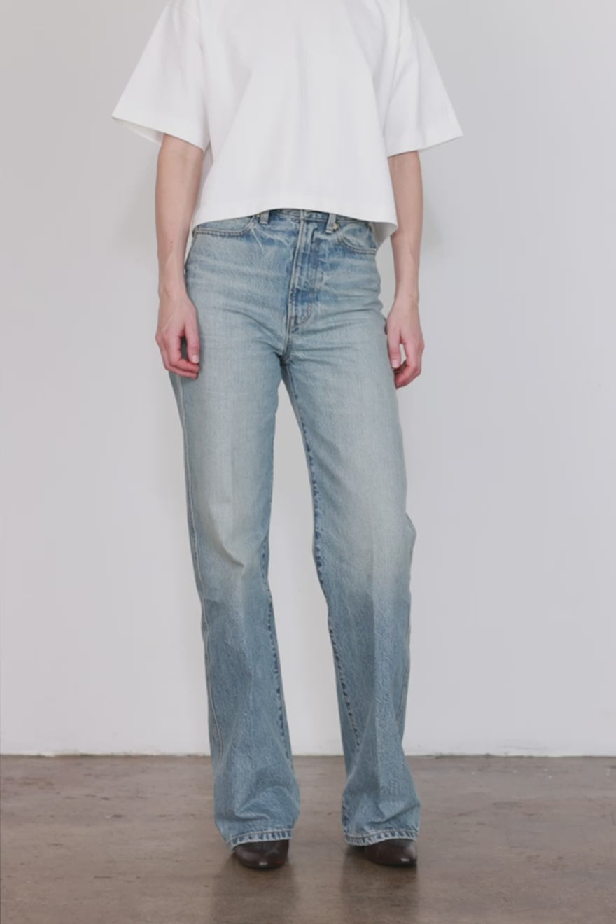 High rise straight leg crafted in heavyweight rigid Japanese denim. Classic 5 pocket detailing with RÙADH signature triple beltloops at back waist and semi-precious gold hardware. This denim gets softer and more comfortable with age and wear. Zip fly, shank closure. Intended to fit with ease, for a tighter fit we suggest sizing down. Made in the USA, finished by hand.