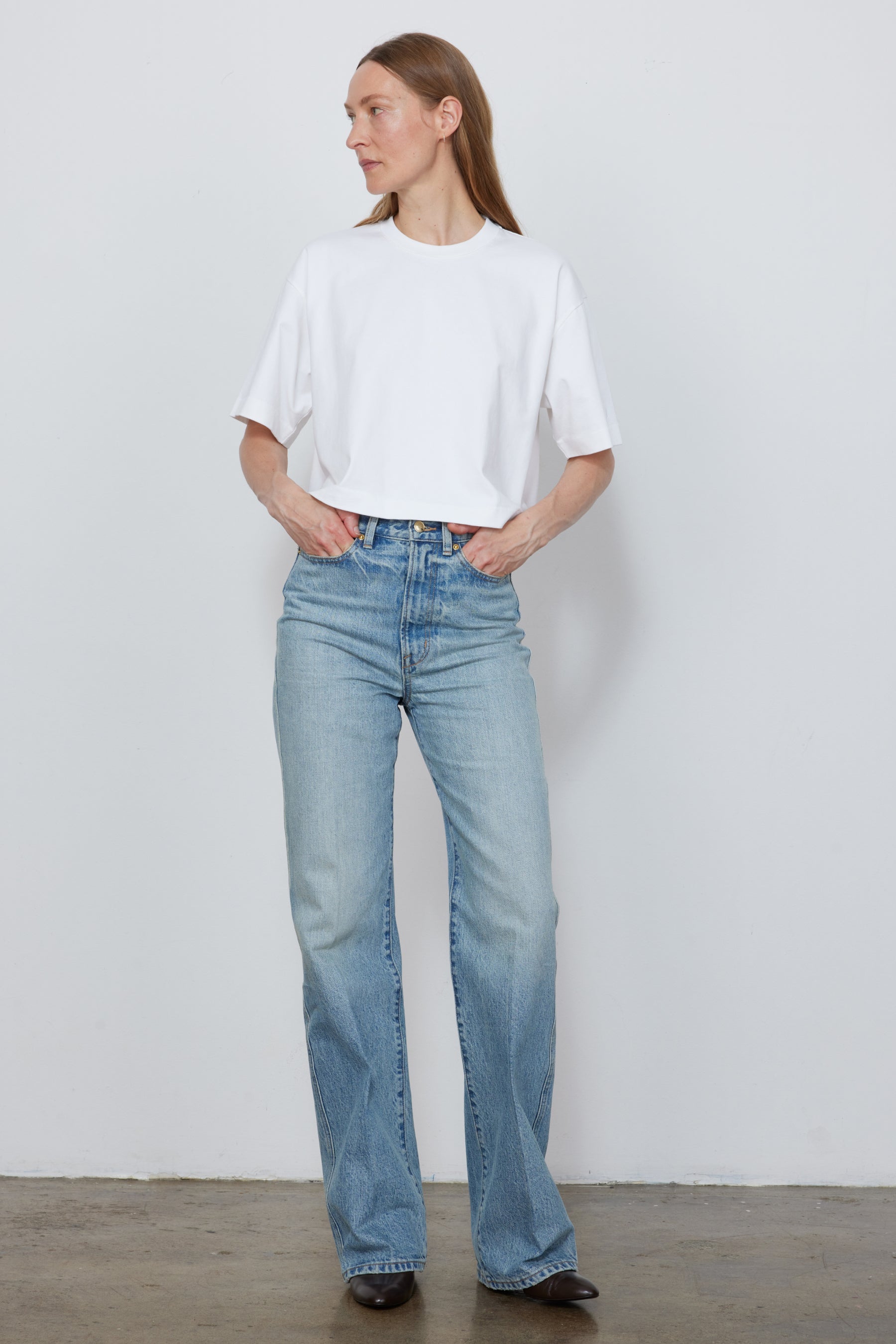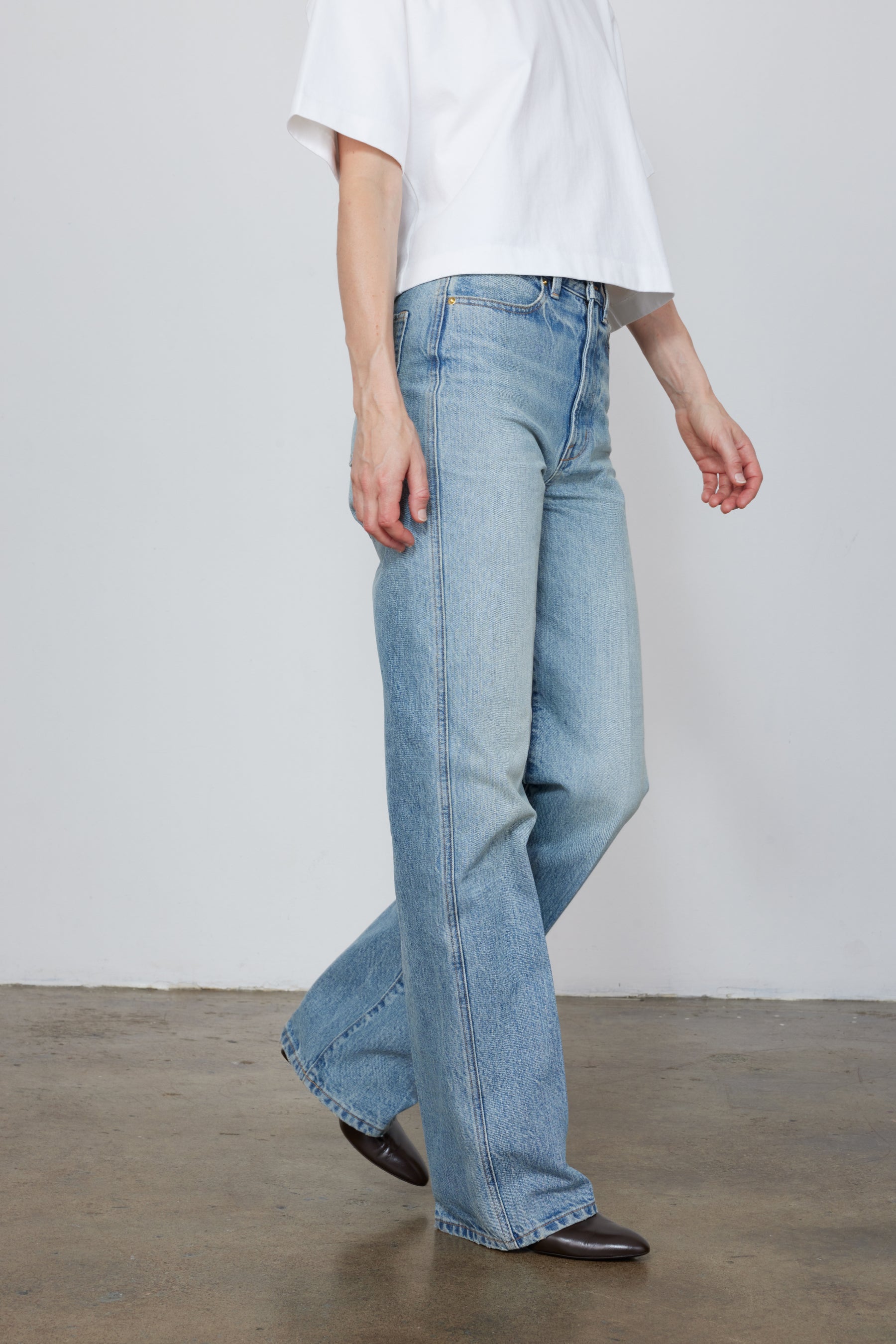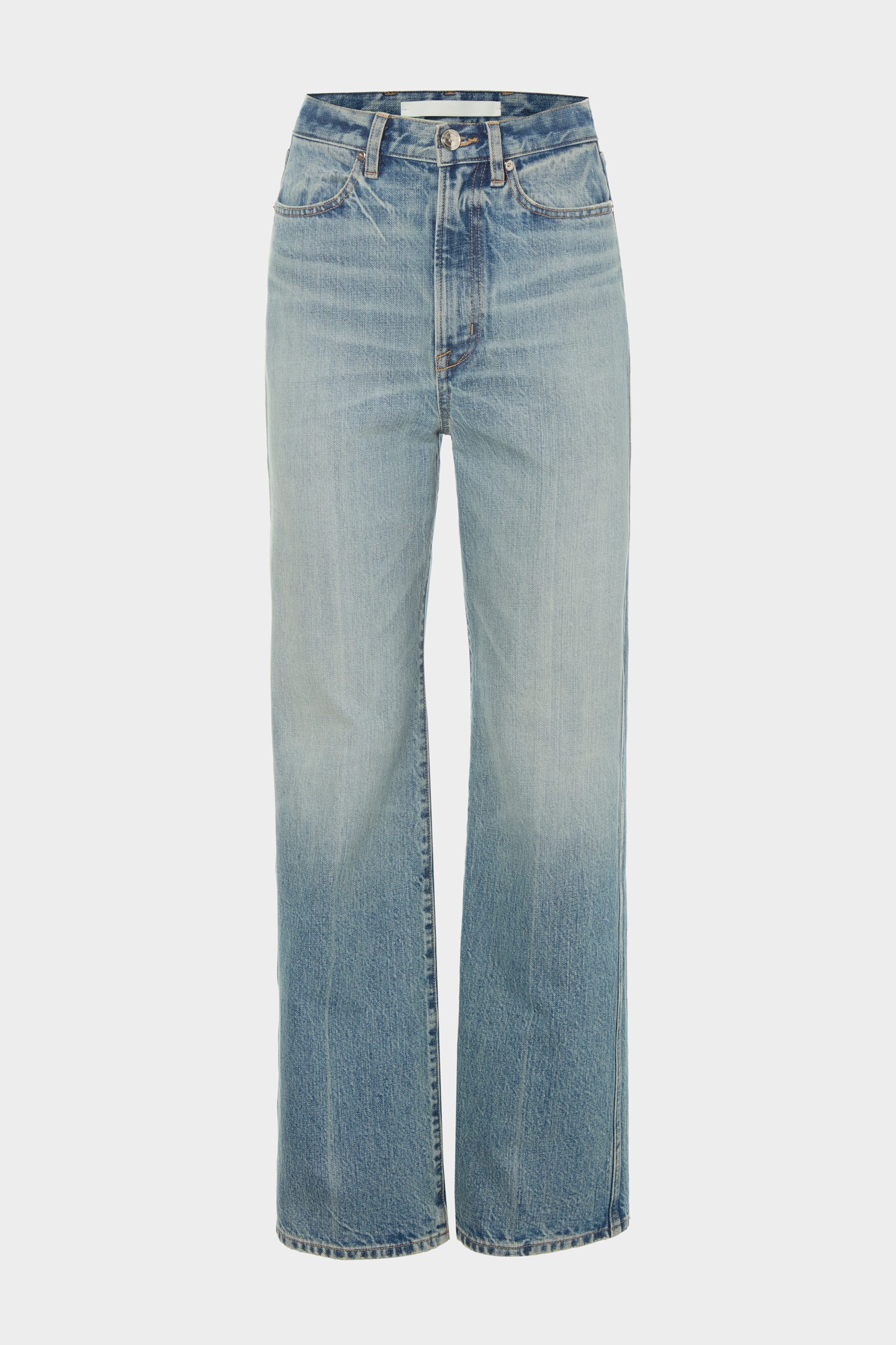 High rise straight leg crafted in heavyweight rigid Japanese denim. Classic 5 pocket detailing with RÙADH signature triple beltloops at back waist and semi-precious gold hardware. This denim gets softer and more comfortable with age and wear. Zip fly, shank closure. Intended to fit with ease, for a tighter fit we suggest sizing down. Made in the USA, finished by hand.