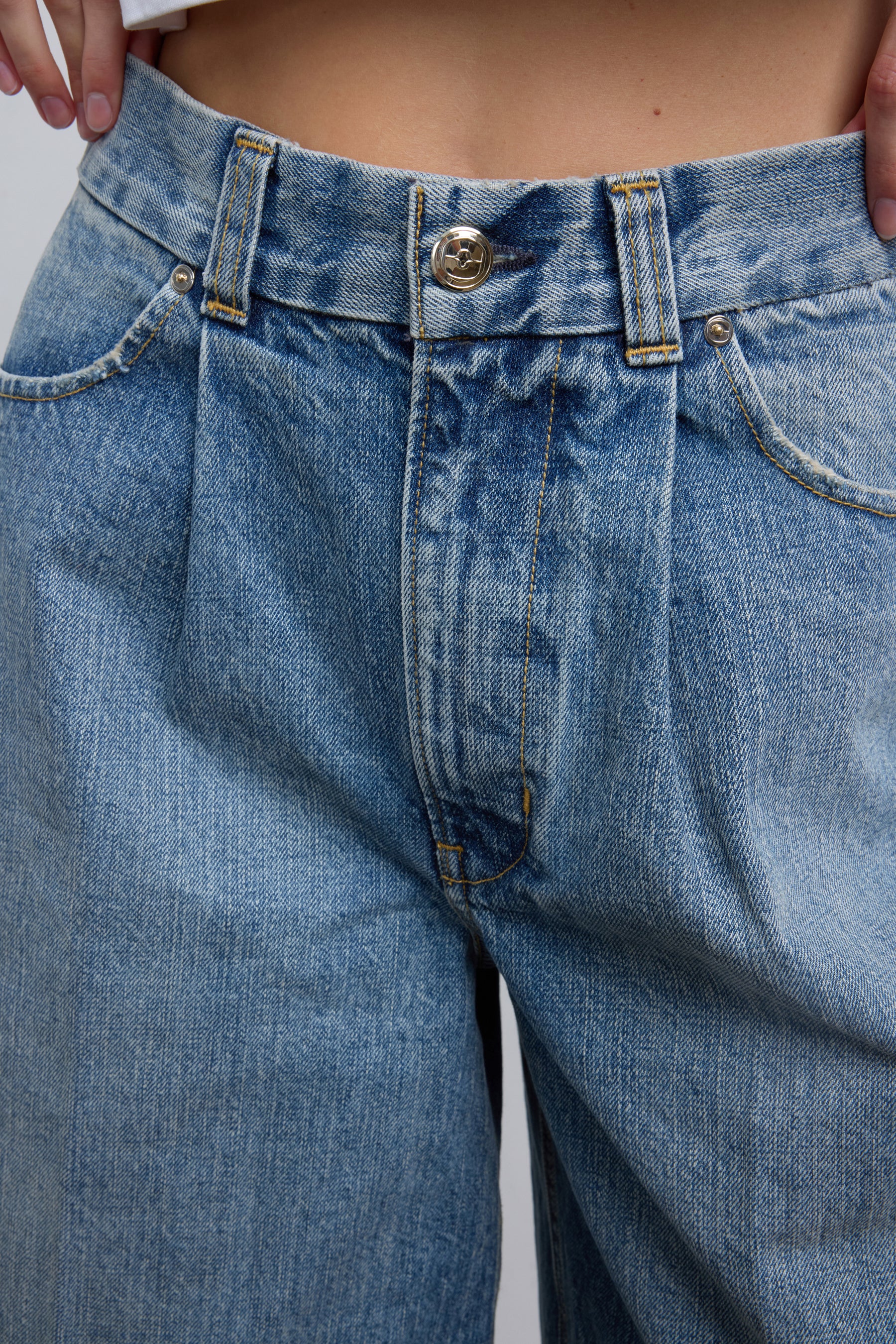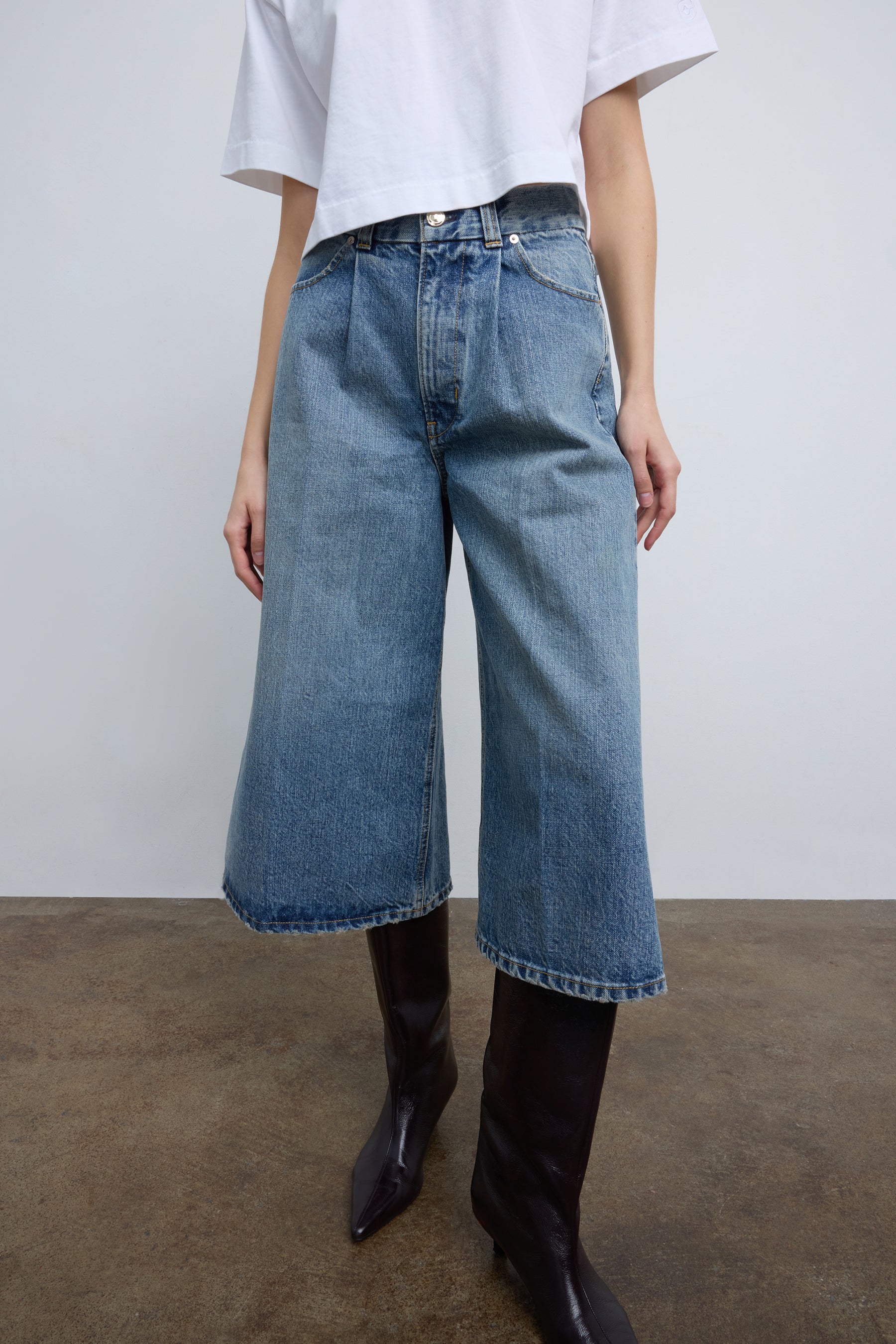 High rise crop gaucho jean in heavyweight rigid Japanese denim. Classic 5 pocket detailing with RÙADH signature triple beltloops at back waist and semi-precious gold hardware. This denim gets softer and more comfortable with age and wear. Zip fly, shank closure. This fit is crafted to hug at the waist and open out to a full crop wide leg. Fits true to size. Made in the USA, finished by hand.