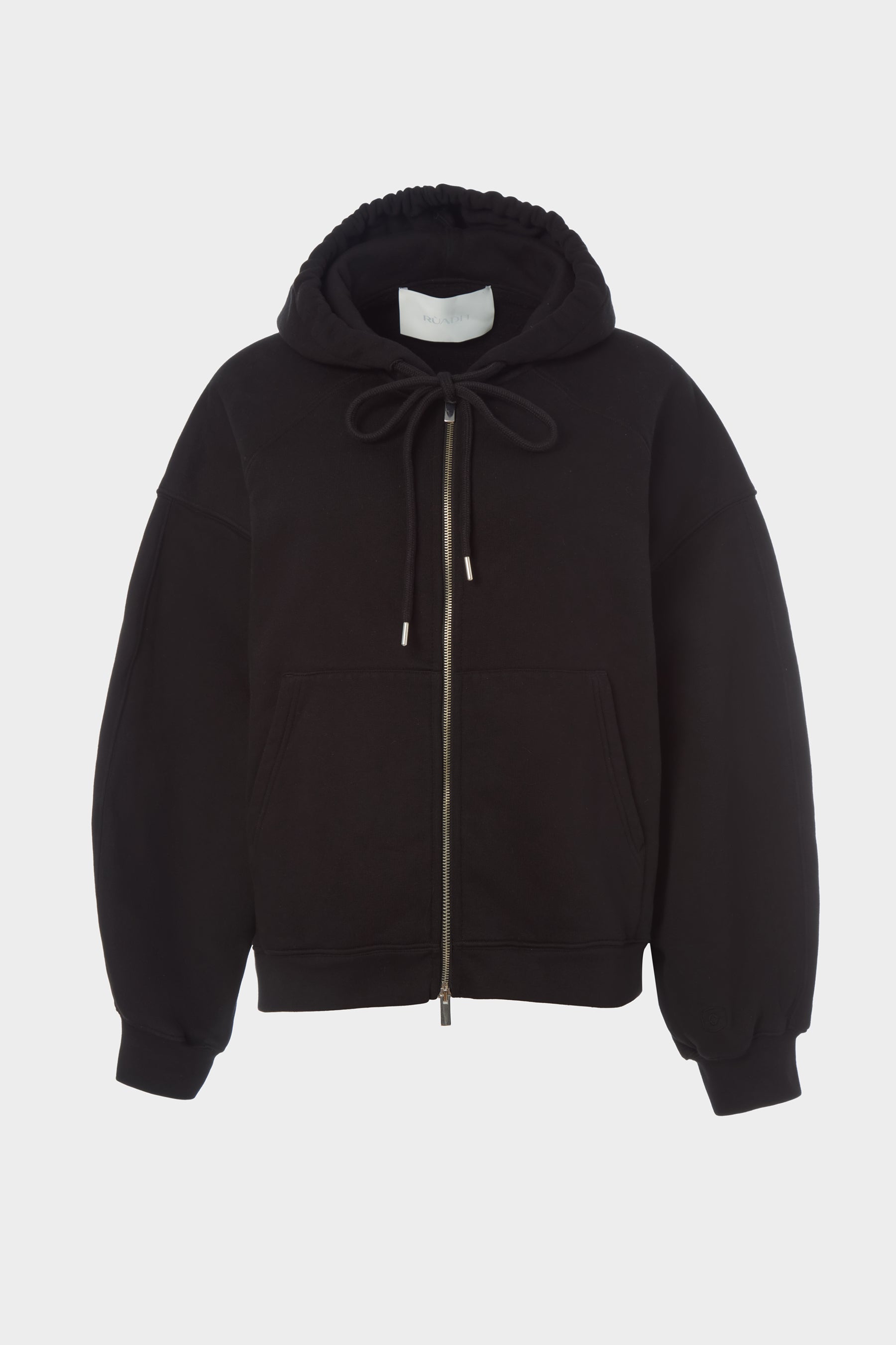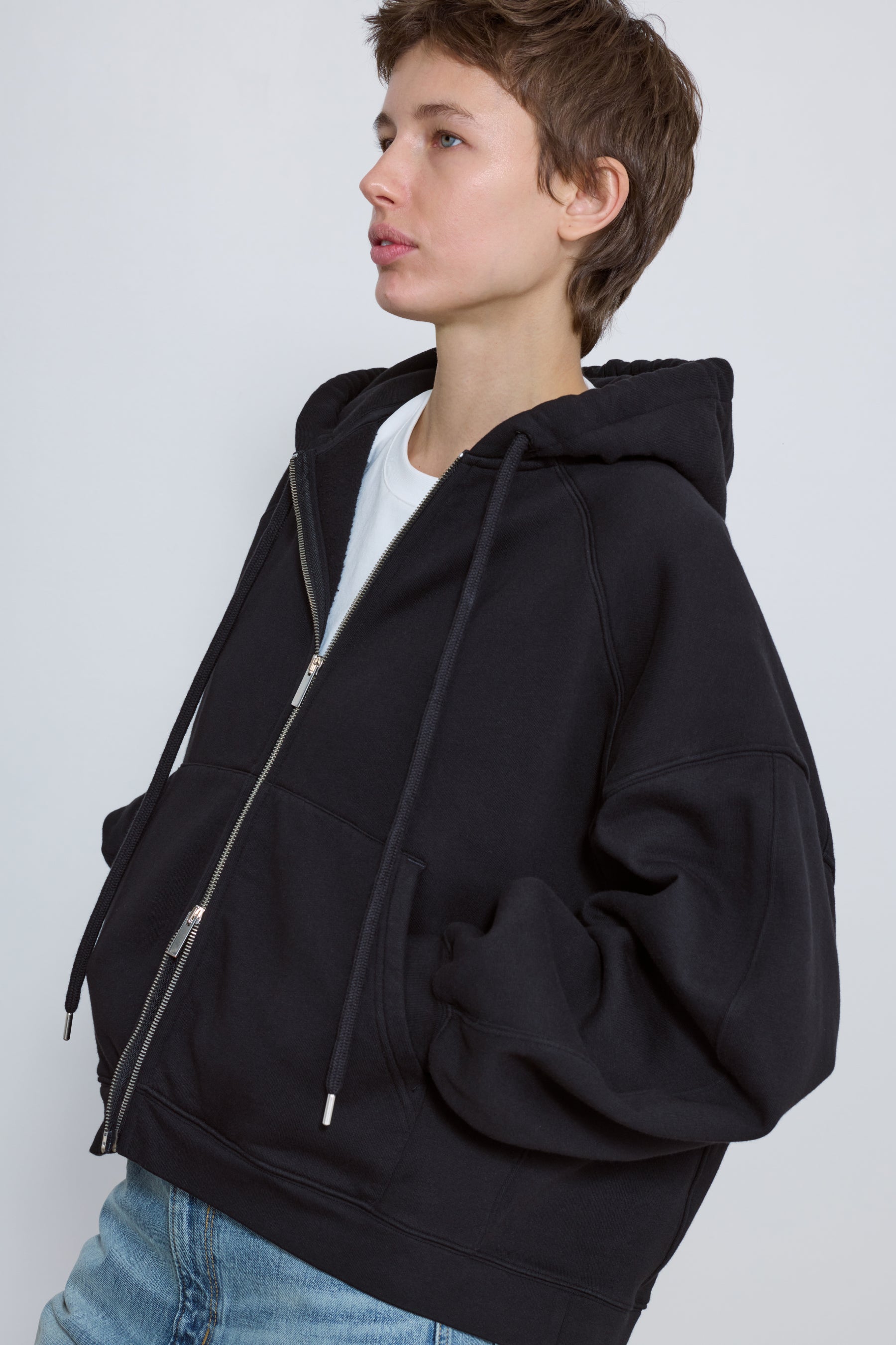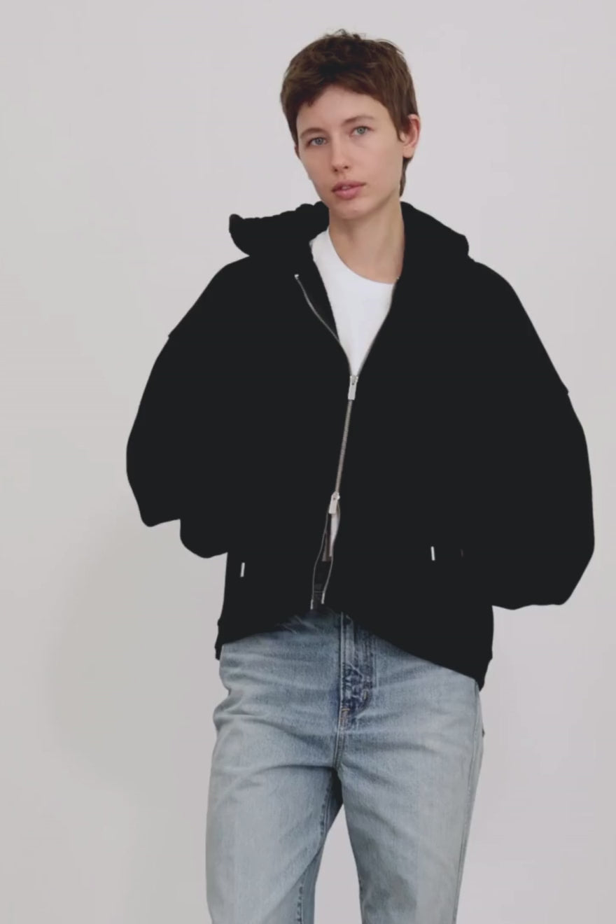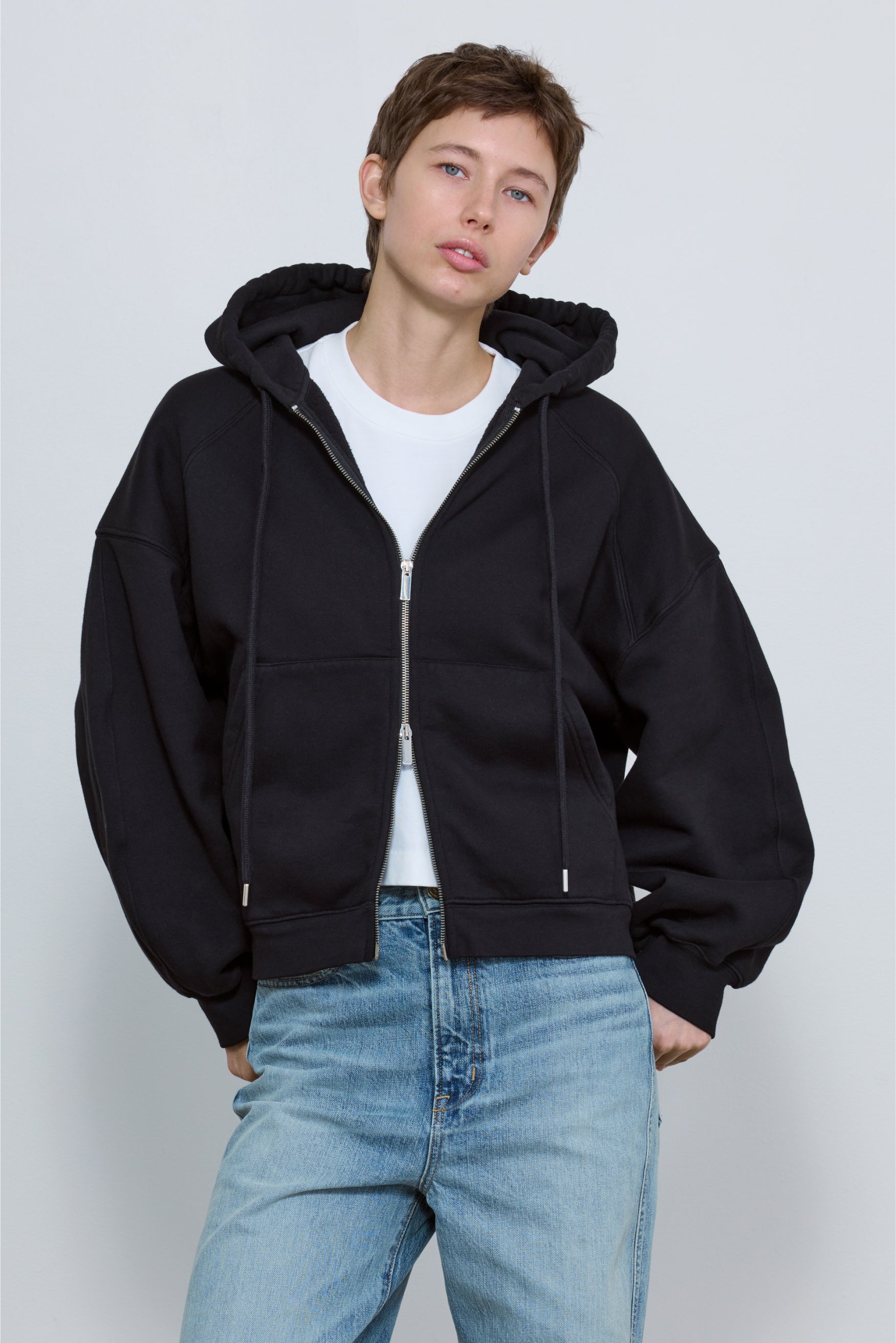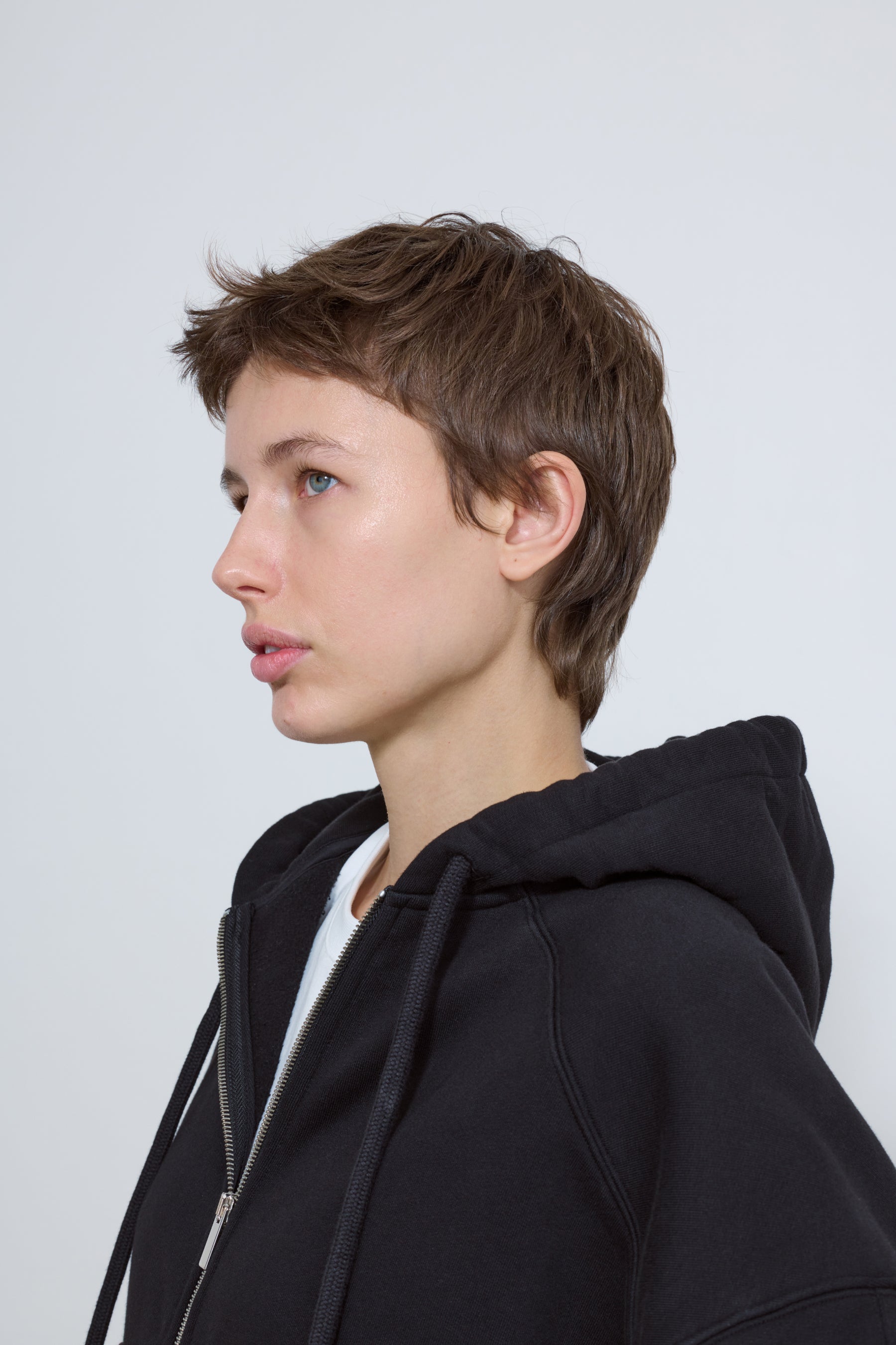 A softly-rounded silhouette, cut in washed organic cotton. The fluid shape has the ease and versatility of a classic hoodie but with thoughtful, sculptural detailing. The Scott features a two-way zipper for styling options, drawcord at hood to cinch, and RÙADH emblem embroidery at sleeve edge. Handcrafted in Portugal.