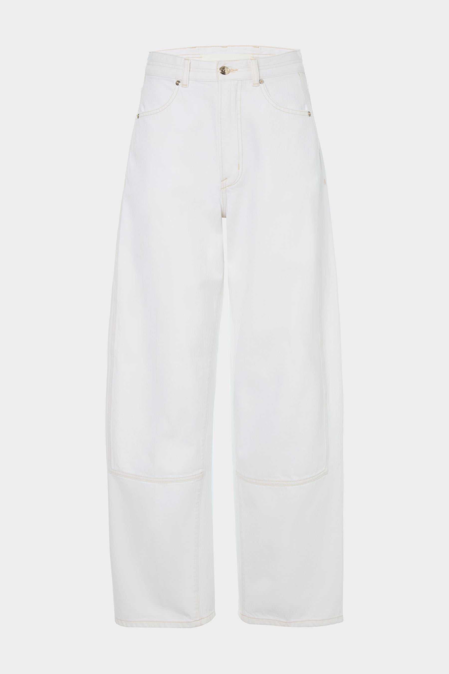 High rise relaxed curved leg jean in recycled cotton rigid denim. This jean features no side seam—the engineering of the fit is created through a single dart. Subtle carpenter detailing with RÙADH signature triple beltloops at back waist and semi-precious gold hardware. Zip fly, shank closure. Made in the USA, finished by hand.